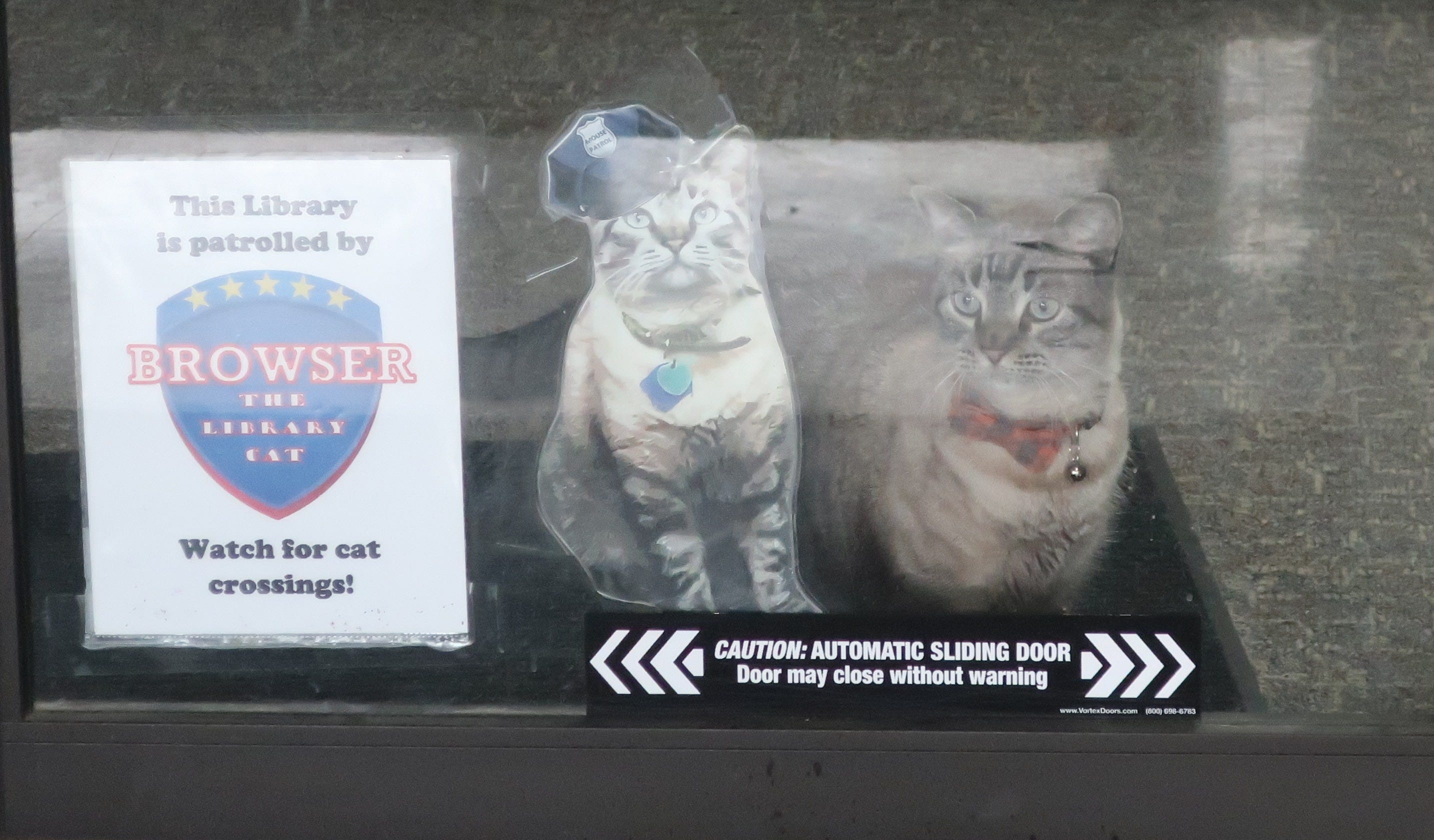 As I was leaving, he ran back to me to walk me out. I noticed what I hadn’t on my way in: his photo is on the door. “This Library is patrolled by Browser the Library Cat: Watch for cat crossings.”