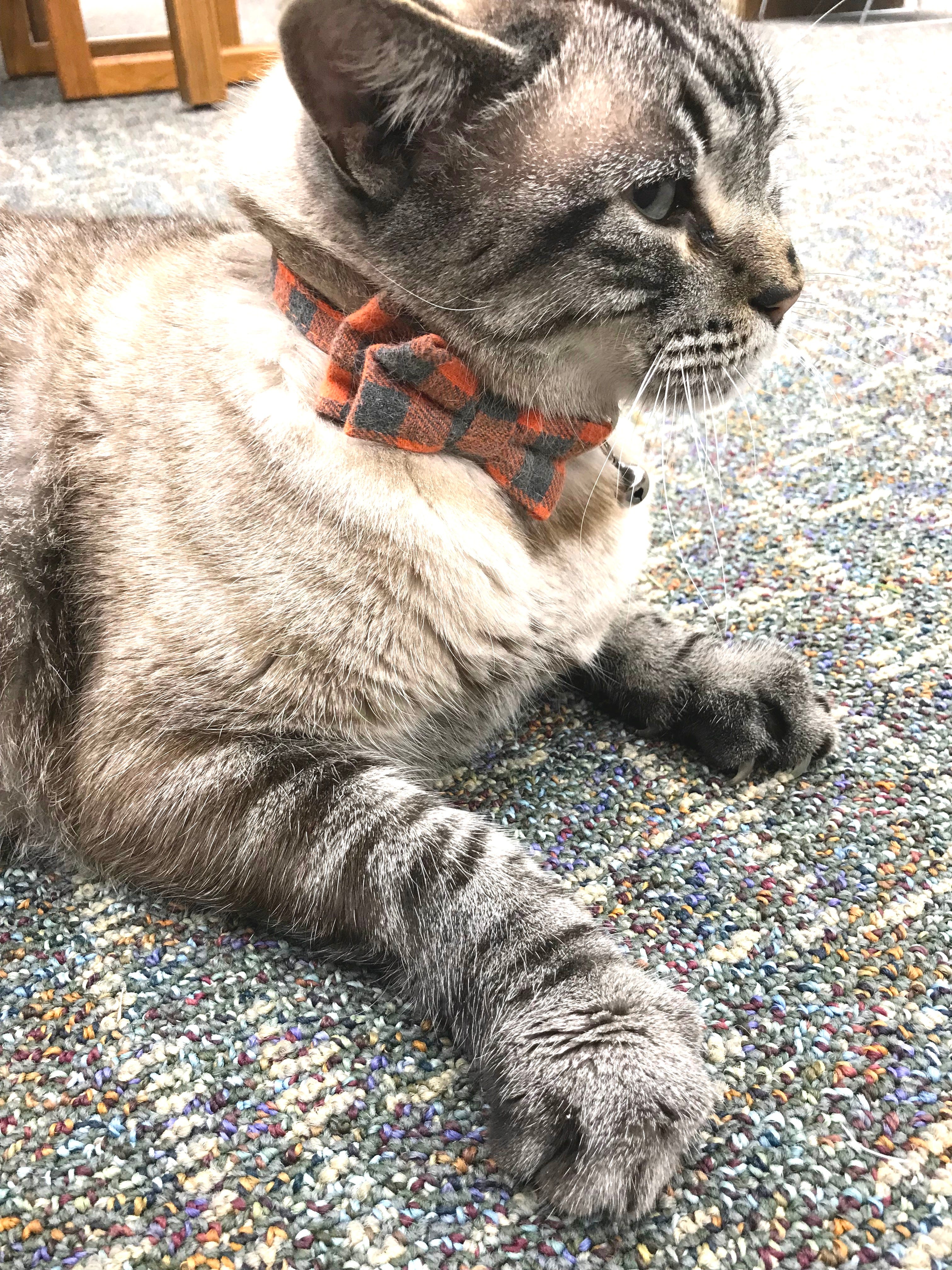 Someone had dressed Browser in a plaid collar with a bow tie, which he wore at a rakish angle. A debonair fashion choice? Or simply forgetting to straighten it after he scratched his ear? I guessed the latter. Browser is a cat constantly in motion, and it’s a challenge taking his photo. This is a cat who doesn’t pose. The pictures of him looking over his shoulder? He’s not ignoring me, he’s keeping an eye on nonfiction.