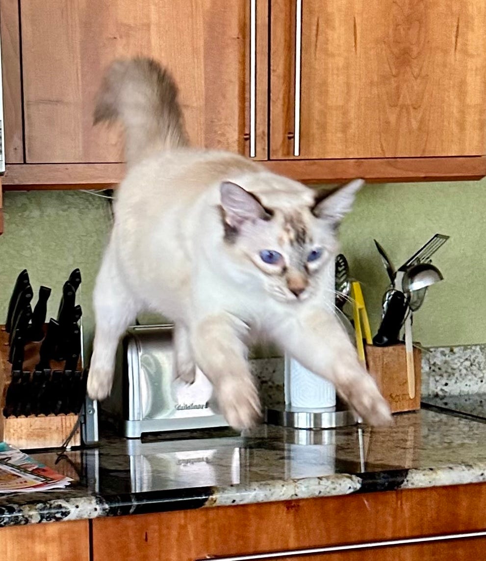 Swing dancing is a huge part of my cat behavior philosophy1. When my father died, I had a seismic realization: I left my house so rarely that one day I would die there and it might take years for the neighbors to notice anything amiss. I feel so sorry for the poor person who’d have to discover my mummified remains. My poor future cats, forced to make do with dead corpse me instead of fancy feast.